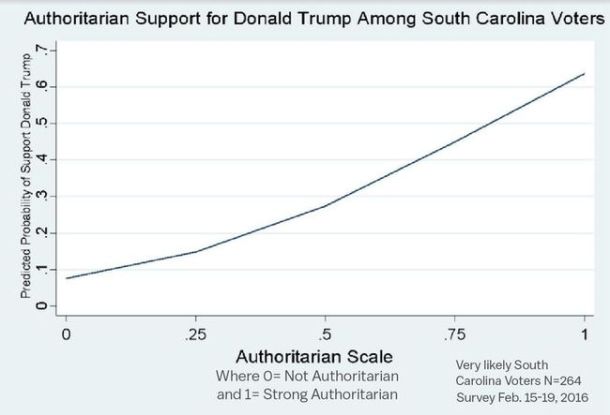 [Matthew MacWillians, a PhD student at U. Mass.] polled a large sample of likely voters, looking for correlations between support for Trump and views that align with authoritarianism. What he found was astonishing: Not only did authoritarianism correlate, but it seemed to predict support for Trump more reliably than virtually any other indicator. He later repeated the same poll in South Carolina, shortly before the primary there, and found the same results, which he published in Vox …