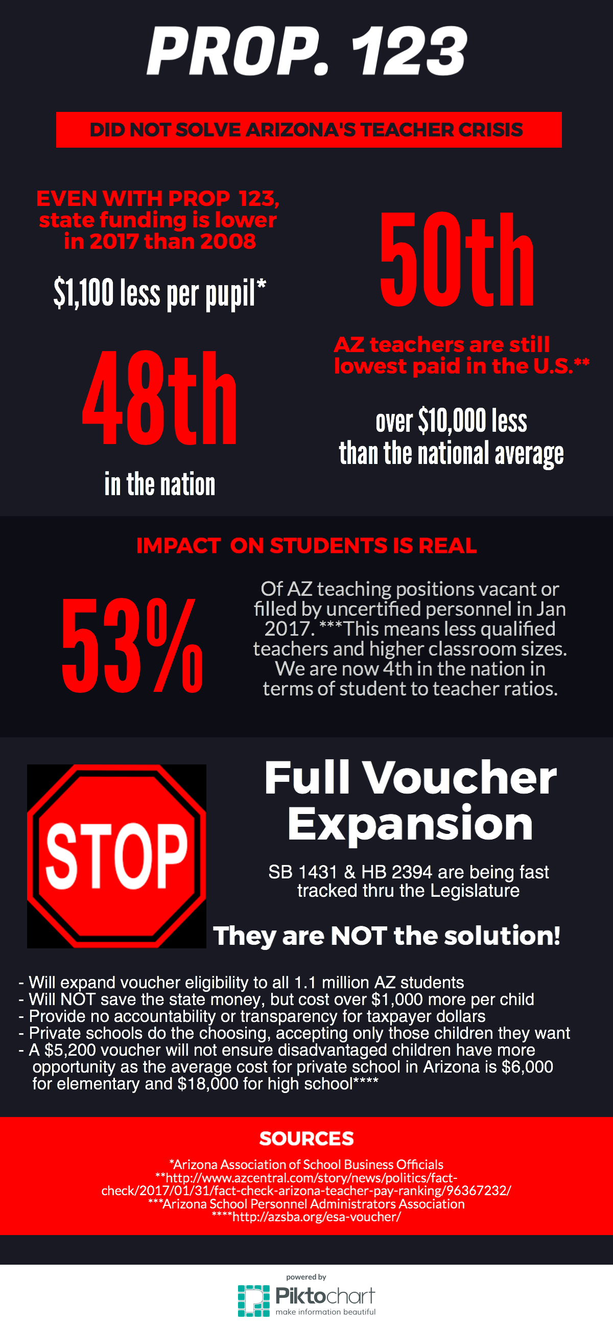 We in Arizona though, know that our Governor hasn’t really put over 80 percent of our kids first. Instead, the self-acclaimed “education governor” has time and again shortchanged our kids. Like with his 2018 spending plan that would provide a 2% pay raise over five years for teachers giving them only about $182 (0.4%) more in the first year. Like with his no-details “plan” to streamline teacher certification requirements to help with the critical teacher shortage, as if less qualified teachers will help our students. Like with his plan to provide $10 million for full-day kindergarten funding at public schools where more than 90% of students are eligible for free or reduced lunch. Unfortunately, for district schools, the entire district must meet the 90% threshold, but for charters, only a single school. In Southern Arizona, only two districts – Nogales Unified and Santa Cruz Valley Unified – qualify. Even Sunnyside Unified School District, at 86 percent of its students on free/reduced lunch, doesn’t qualify. And, like when he negotiated a deal to pay the schools 70% of what they were owed with money that was already theirs and promised that would just be the beginning. As David Safier points out in the Tucson Weekly, the $325 million per year Prop. 123 is bringing in (again, money the schools were already owed, not a plus up), could easily be wiped out by “his latest attack on public education which could drain $150-$300 million” via vouchers.